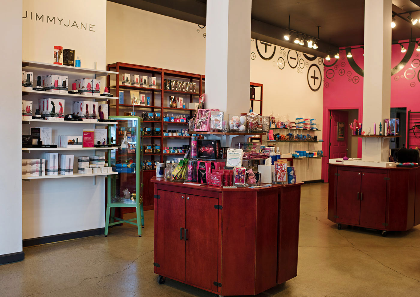 The dimensional logo sign takes advantage of the store's natural light to add an eye-catching, dynamic presence above the checkout counter as shine and shadow change across the wall during the day. The making of this sign was a custom process developed by our partner, RainMaker Signs, to give us a striking magenta "anodized aluminum" look. Read their process re-cap here.